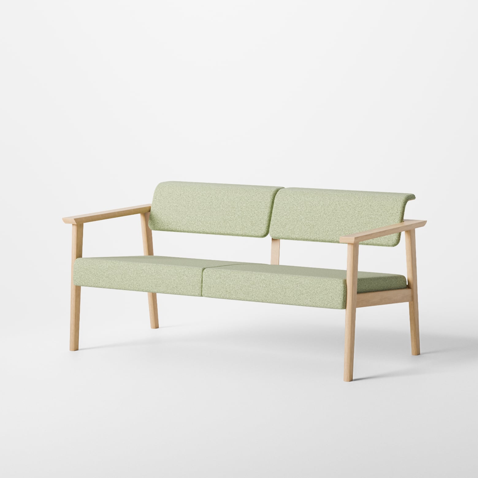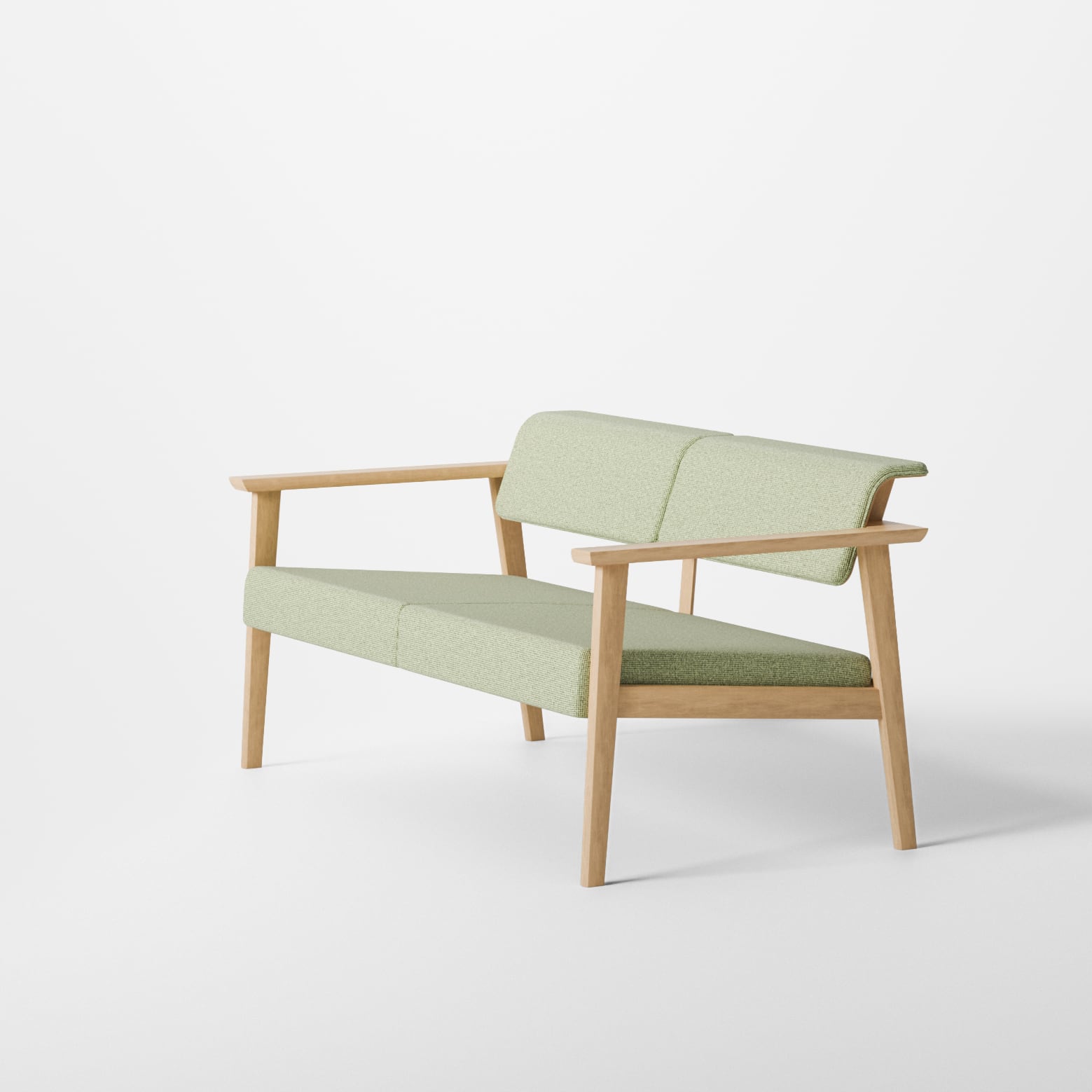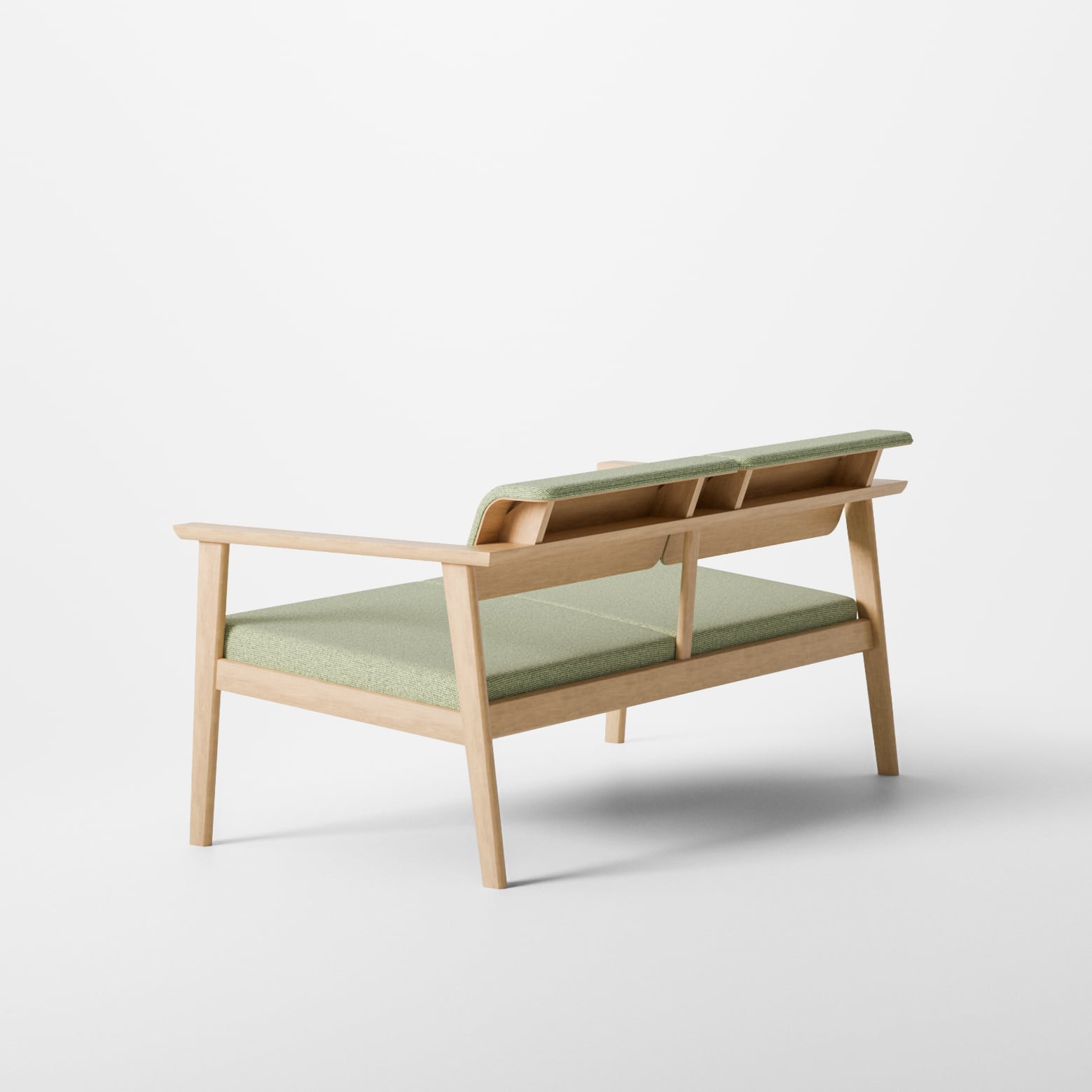 直線を基調としたデザインのフレームと緩く曲げられた背板が特徴的なソファ