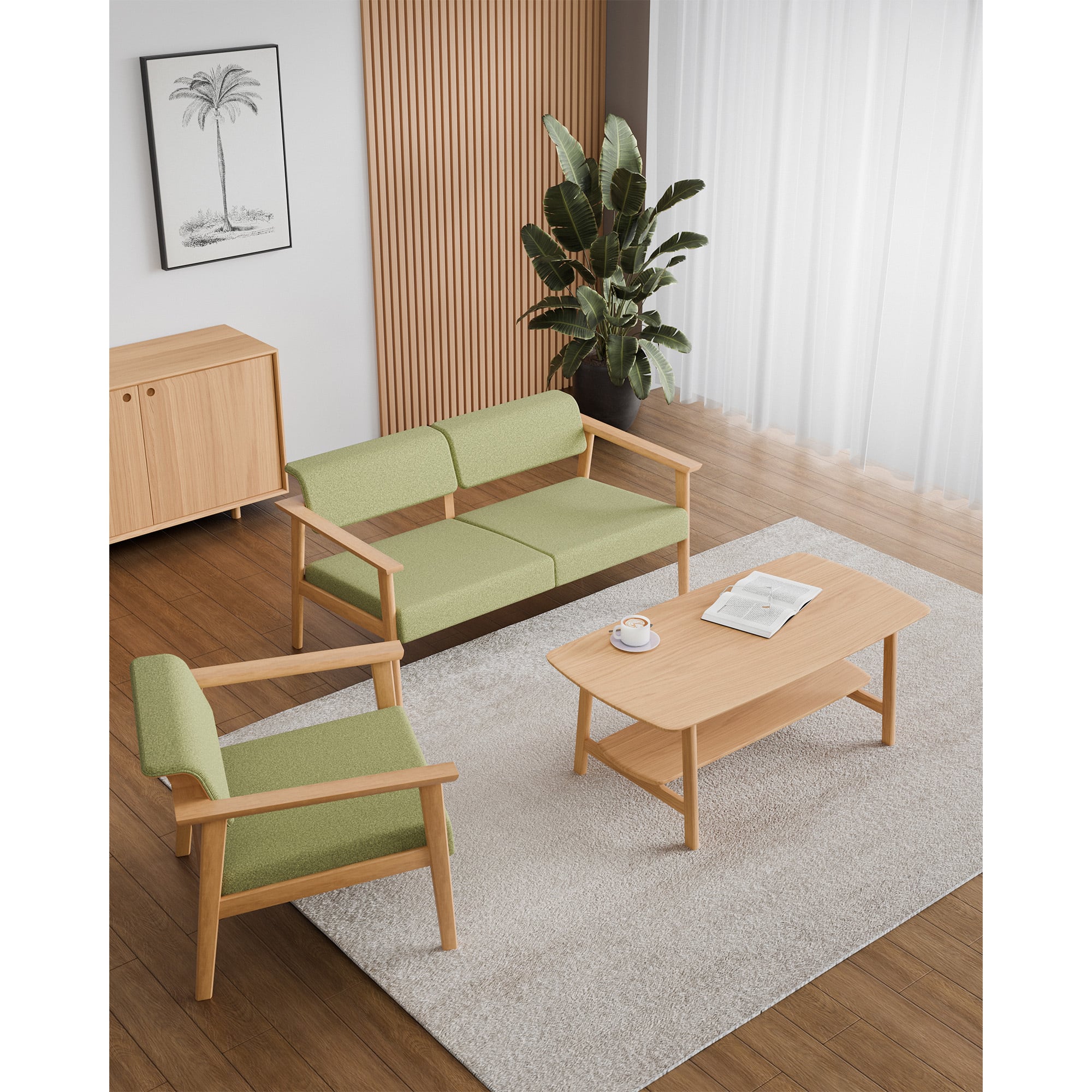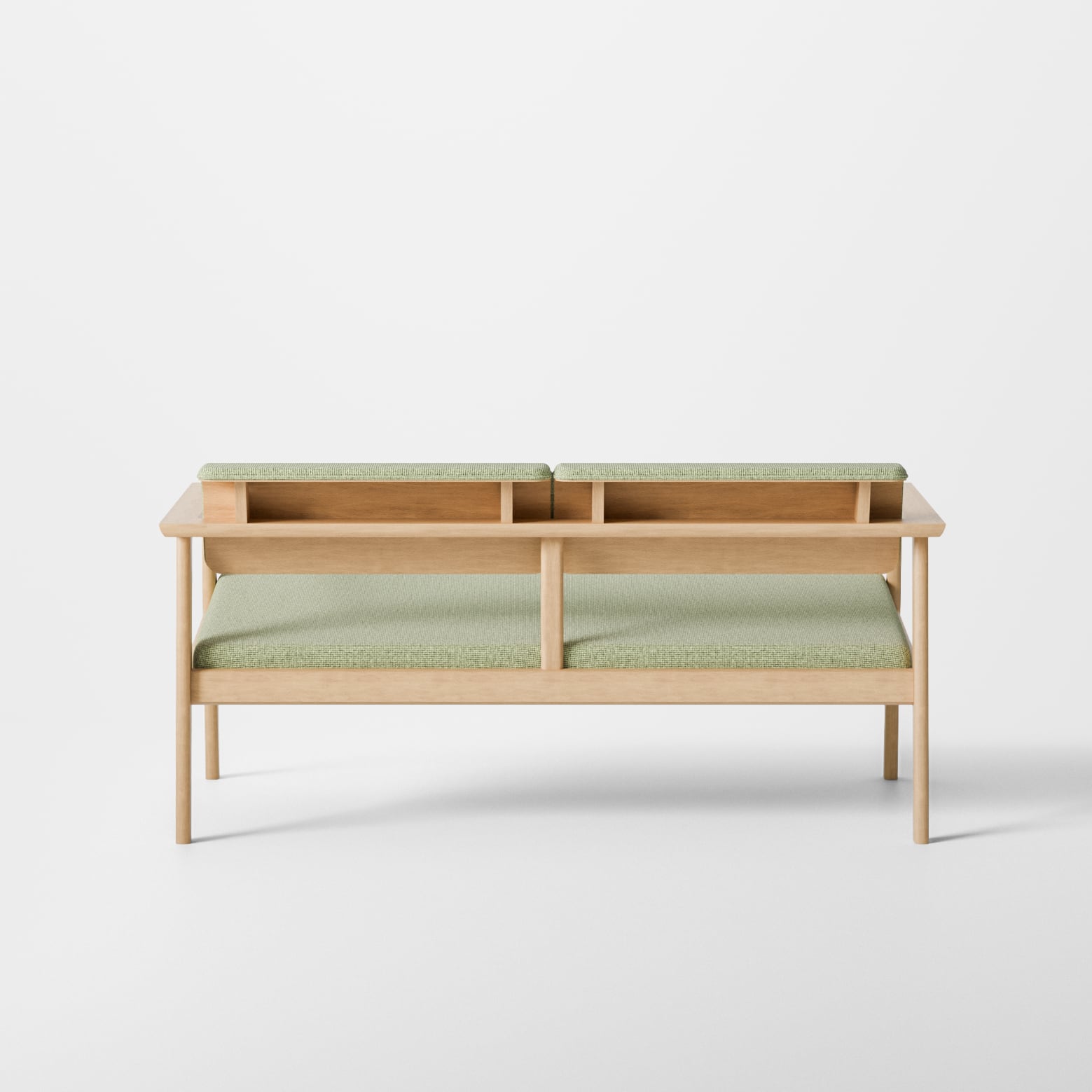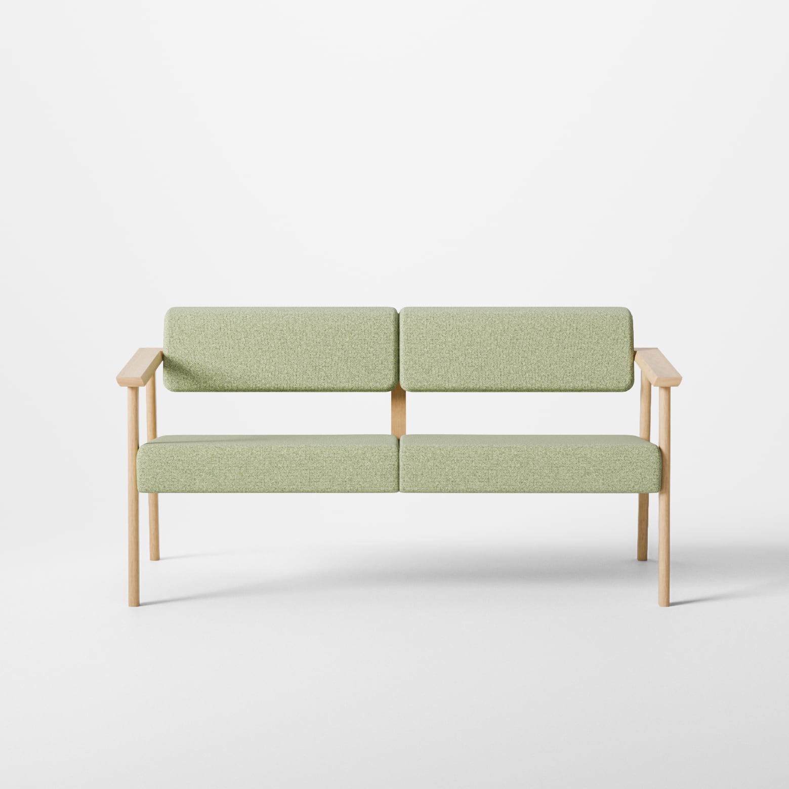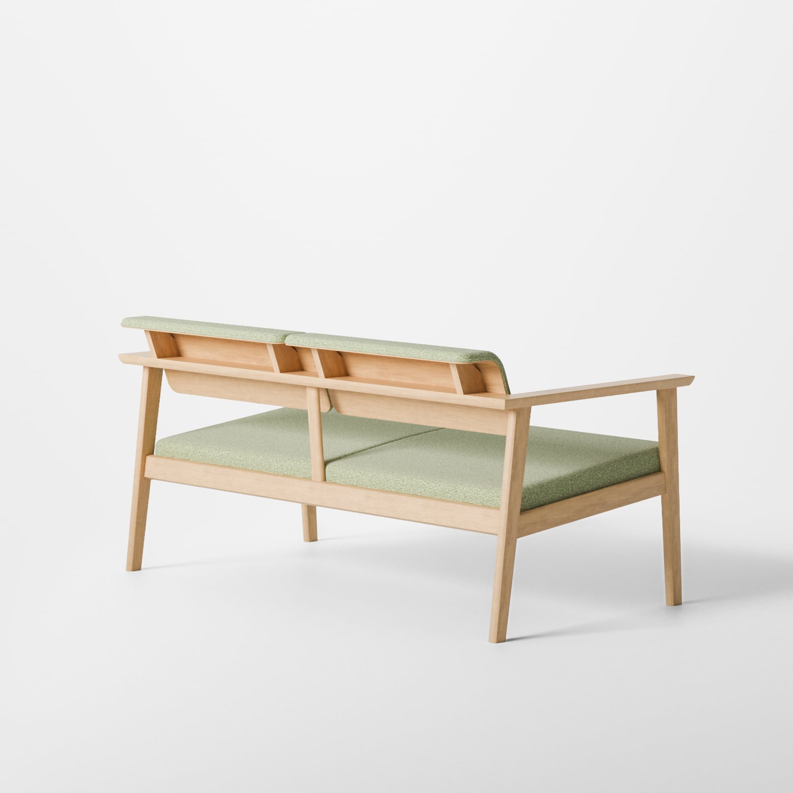直線を基調としたデザインのフレームと緩く曲げられた背板が特徴的なソファ